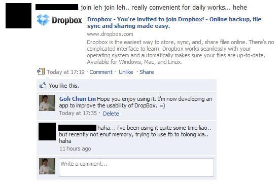 For those who are familiar with Dropbox should know that whenever someone signs up with Dropbox through a link we sent them, Dropbox will credit both us and the new user 250 MB of free storage. This is also famously known as the Referrals feature. Thus, my friend posted the Dropbox link on his Facebook wall to easily get people signing up as Dropbox new user. The reason was, as he said, he required more space on Dropbox.