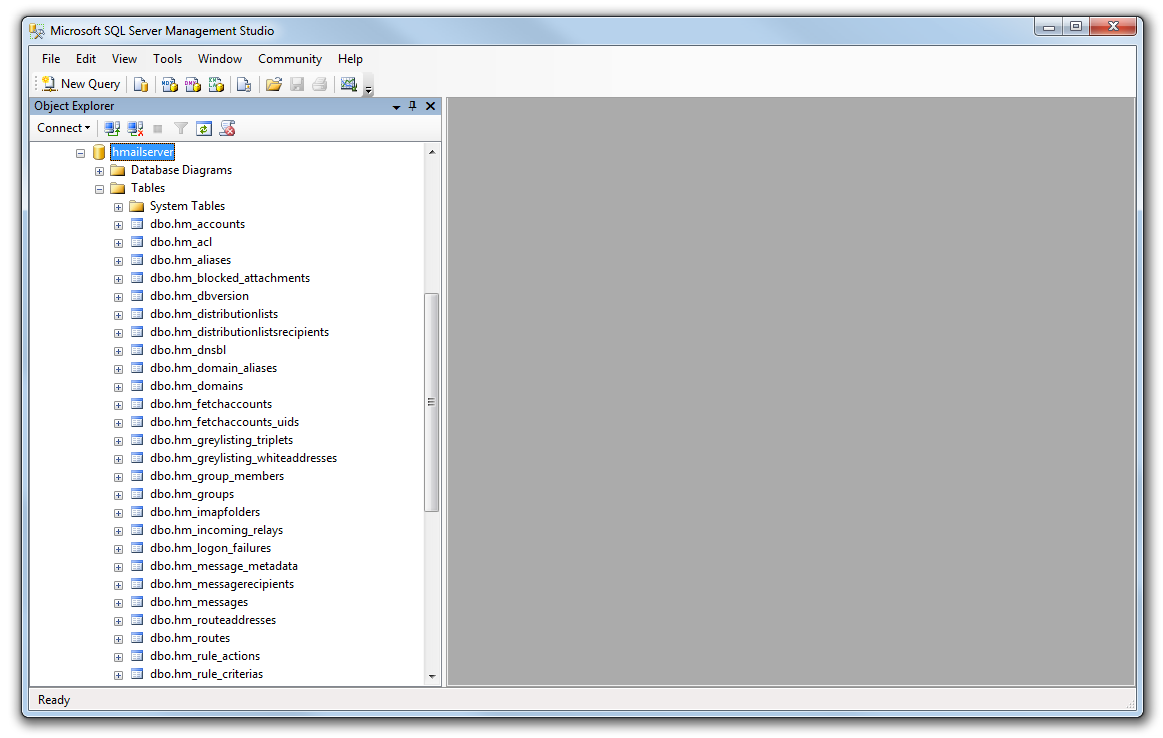 If the option of using external database engine was chosen earlier during the installation, we will need to go through another step of seting up the hMailServer database. We are basically given three options to choose: MS SQL Server, MySQL, and PostgreSQL. The following screenshot shows the database created in MS SQL Server after finishing the database setup.