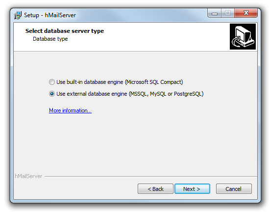 After that, we will have to choose a database server type. We can chose either built-in database engine (MS SQL Compact) or external database engine (MS SQL, MySQL or PostgreSQL). According to the hMailServer documentation, built-in database engine option is only suitable for personal use, instead of commercial use because the Microsoft SQL Server Compact Edition comes with hMailServer is limited to only 4GB.