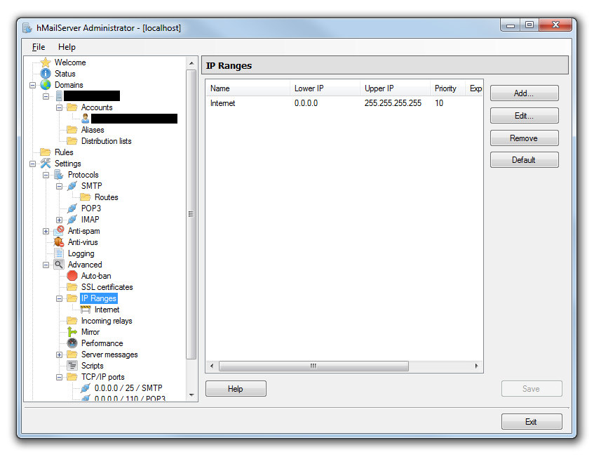 Finally, to prevent this personal email server vulnerable to spam, we should configure the hMailServer IP range. By default, the option Internet has a IP range from 0.0.0.0 to 255.255.255.255. This has to be disabled otherwise hMailServer will promt a critical configuration warning at the Status page.