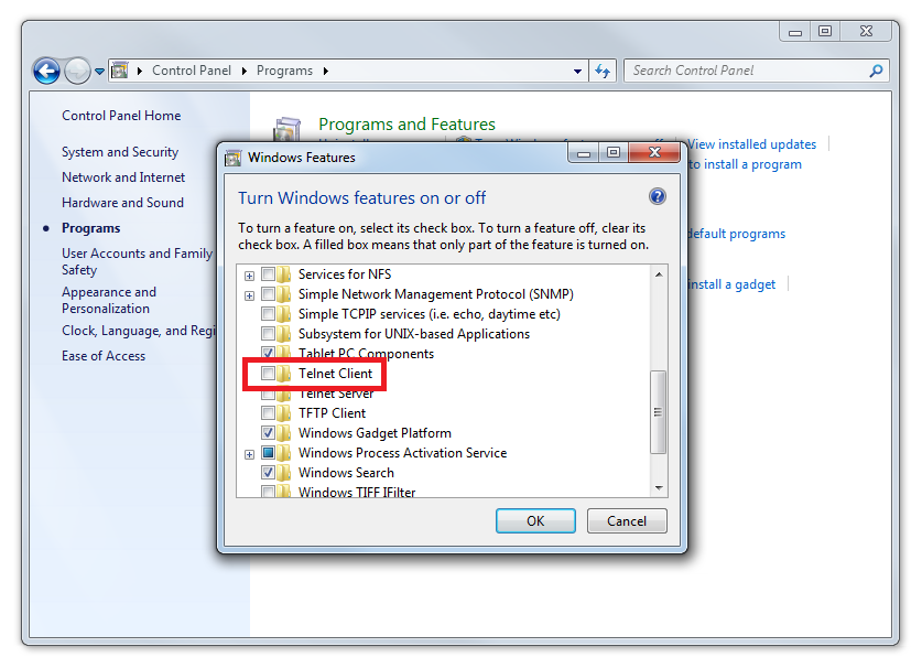 However, since the Telnet client has been removed in recent versions of Windows, we will need to add it back in Windows Features before we can try out the command above. Otherwise we will get an error message saying telnet is not recognized as an internal or external command.