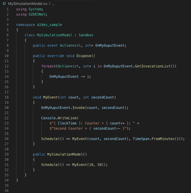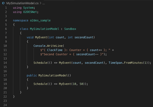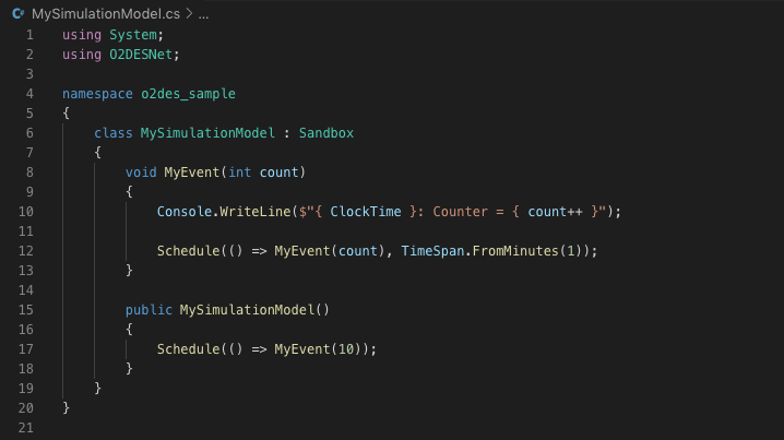 Now we can proceed with our Hello World model which is extended from the abstract class Sandbox from the O2DES.NET library. The following screenshot shows how we do it.