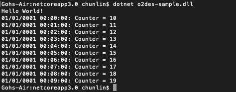 We can control the number of events by inputing the event count into the Run method. So, when we do simulation.Run(10), the event will only happen 10 times and thus only 10 lines are printed.