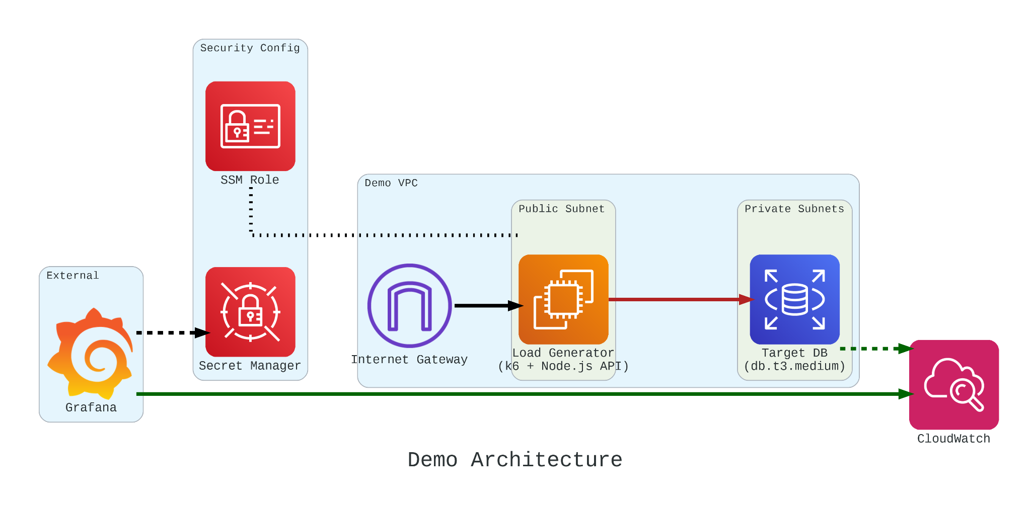 - The Generator: An EC2 instance running k6. We chose k6 because it allows us to write performance tests in JavaScript that are both developer-friendly and incredibly powerful.