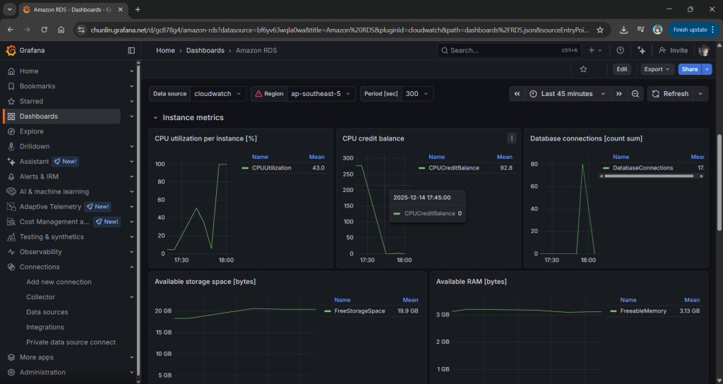 We use Grafana to transform raw CloudWatch signals into a peaceful dashboard. While “Unlimited Mode” keeps the latency flat, Grafana reveals the truth: Our credit balance decreases rapidly when CPU utilisation goes up to 100%.