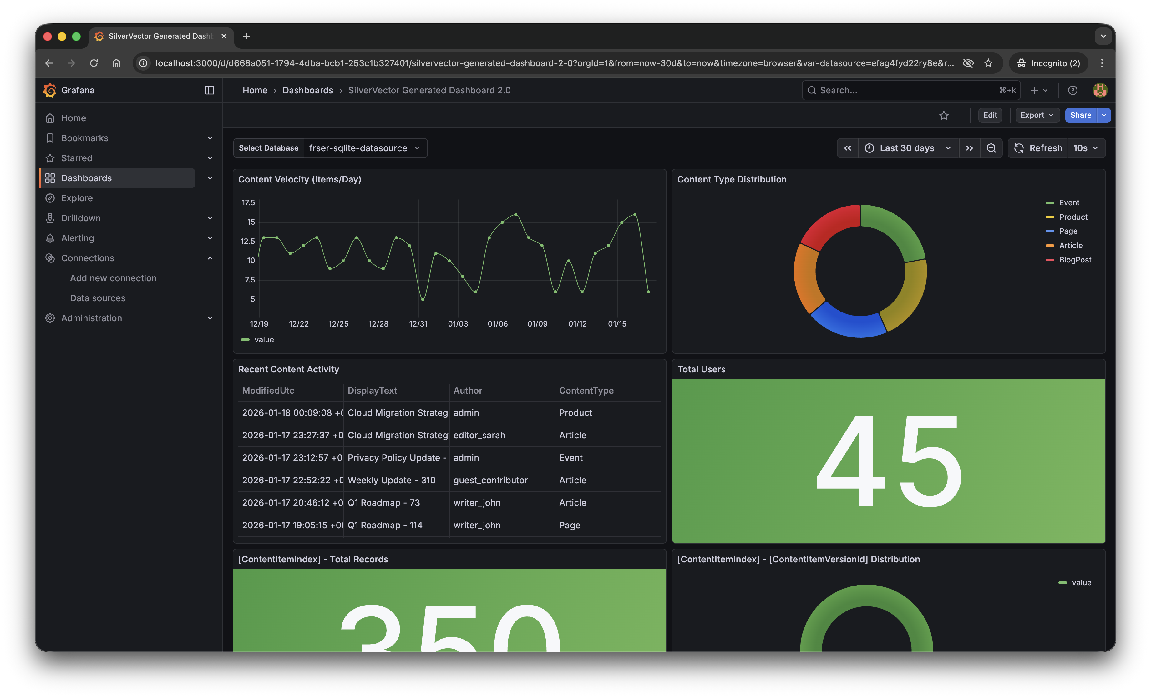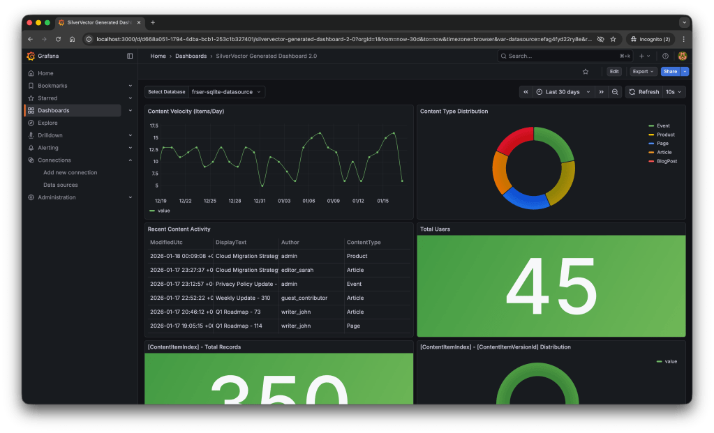 SilverVector gives you the foundation. We generate the boring boilerplate, i.e. the grid layout, the panel IDs, the basic SQL queries. Once you have that JSON, you are free to extend it! For example, you want to add CPU Usage? Just add a panel for your server metrics. Want to track Page Views? Join it with your IIS/Nginx logs.
