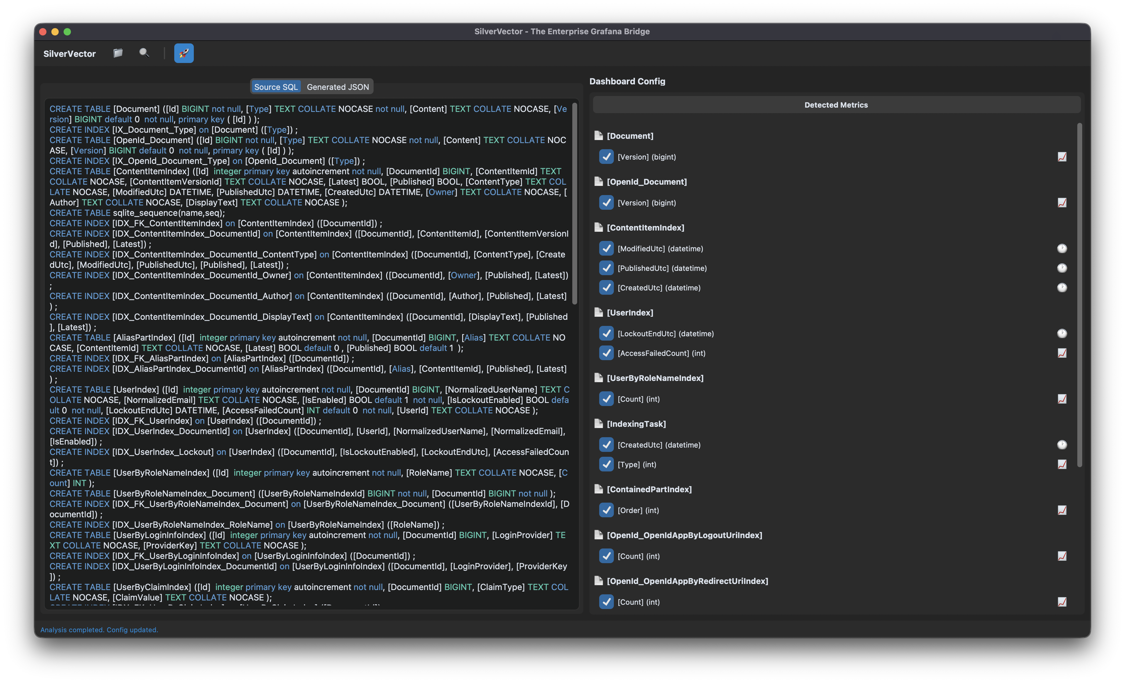 With a single click of the “blue rocket” button, SilverVector generated a JSON dashboard pre-configured with: