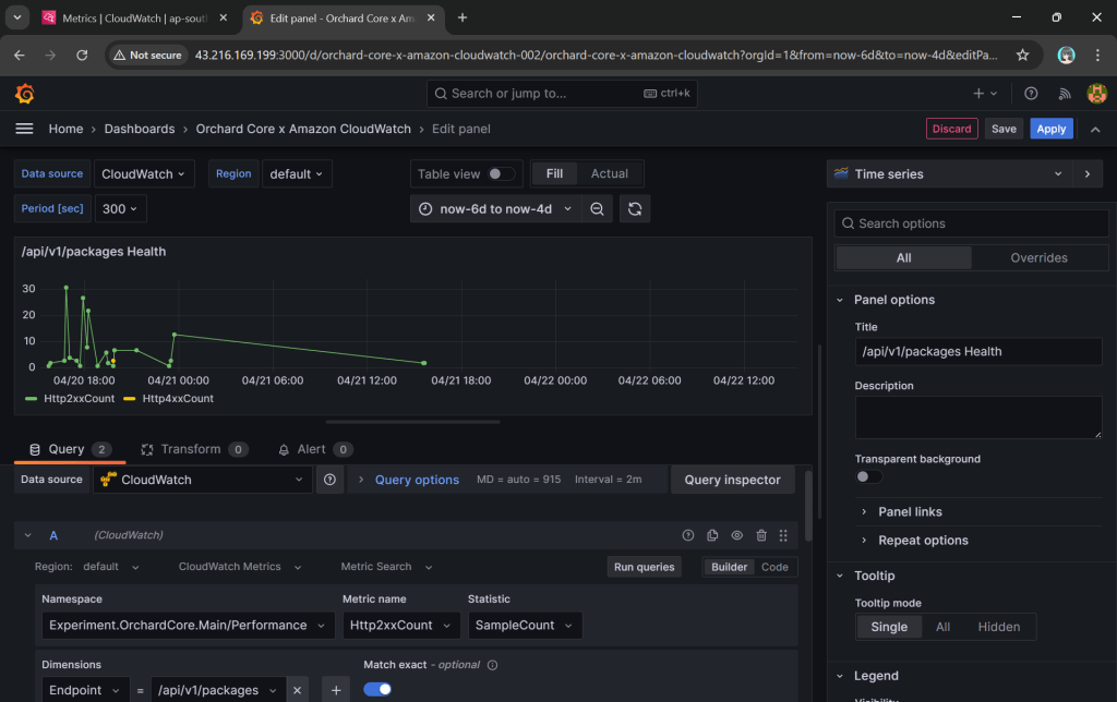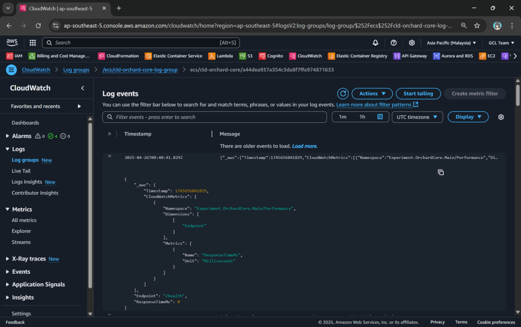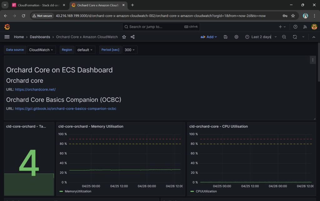Instead of relying solely on basic Amazon CloudWatch metrics, I decided to build a custom monitoring pipeline that has Grafana running on Amazon EC2 receiving metrics and EMF (Embedded Metrics Format) logs sent from the Orchard Core on ECS via CloudFormation configuration.