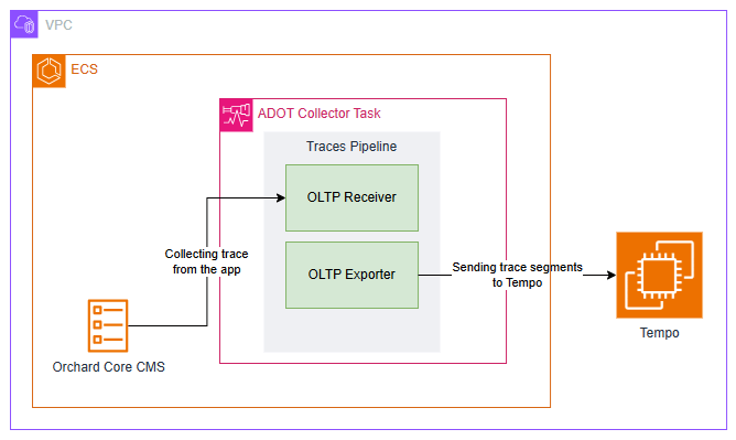 ADOT is a secure, AWS-supported distribution of the OpenTelemetry project that simplifies collecting and exporting telemetry data from apps running on AWS services, for example our Orchard Core on ECS now. ADOT decouples our apps from the observability backend, provides centralised configuration, and handles telemetry collection more efficiently.