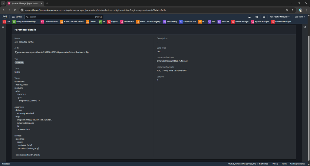 The following CloudFormation template shows how we deploy ADOT as a sidecar in ECS using CloudFormation. The collector config is stored in AWS Systems Manager Parameter Store under /myapp/otel-collector-config, and injected via the AOT_CONFIG_CONTENT environment variable. This keeps our infrastructure clean, decoupled, and secure.