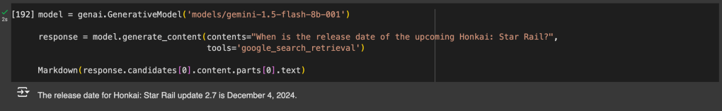 With this feature enabled, we thus can ask Gemini to get some real-time data from the Internet, as shown below.