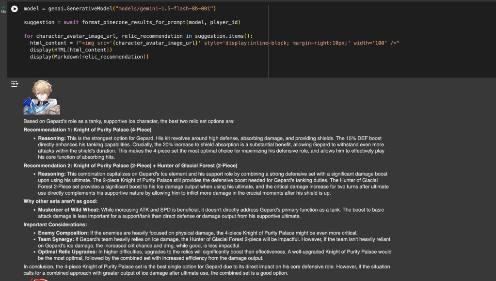 After Pinecone returns matches, the code constructs a detailed prompt for the Gemini model. This prompt includes the character’s description, relevant relic sets found by Pinecone, and crucial instructions for the model. The instructions emphasise the constraints of choosing relic sets: either a 4-piece set, or two 2-piece sets, not a mix. Importantly, it also tells Gemini to consider the character’s existing profile and to prioritise fitting relic sets.