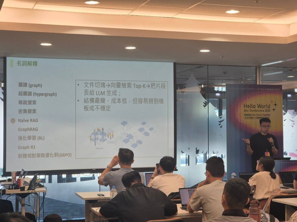 The most technically demanding session came from Nils (劉岦崱), a Senior Data Scientist at Cathay Financial Holdings. He presented GraphRAG, a significant evolution beyond the “Naive RAG” most of us use today.