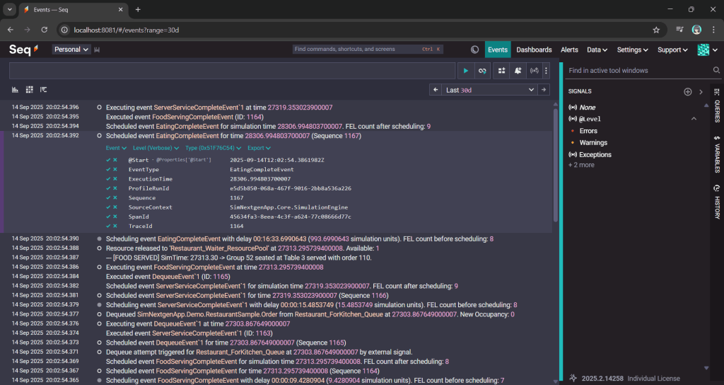 By using Serilog, our .NET Engine does not just write text. Instead, it emits machine-readable events with key-value pairs for our parameters and results. Every log entry contains the input parameters (for example, { "WorkerCount": 5, "ServiceTime": 10 }) attached to the result.