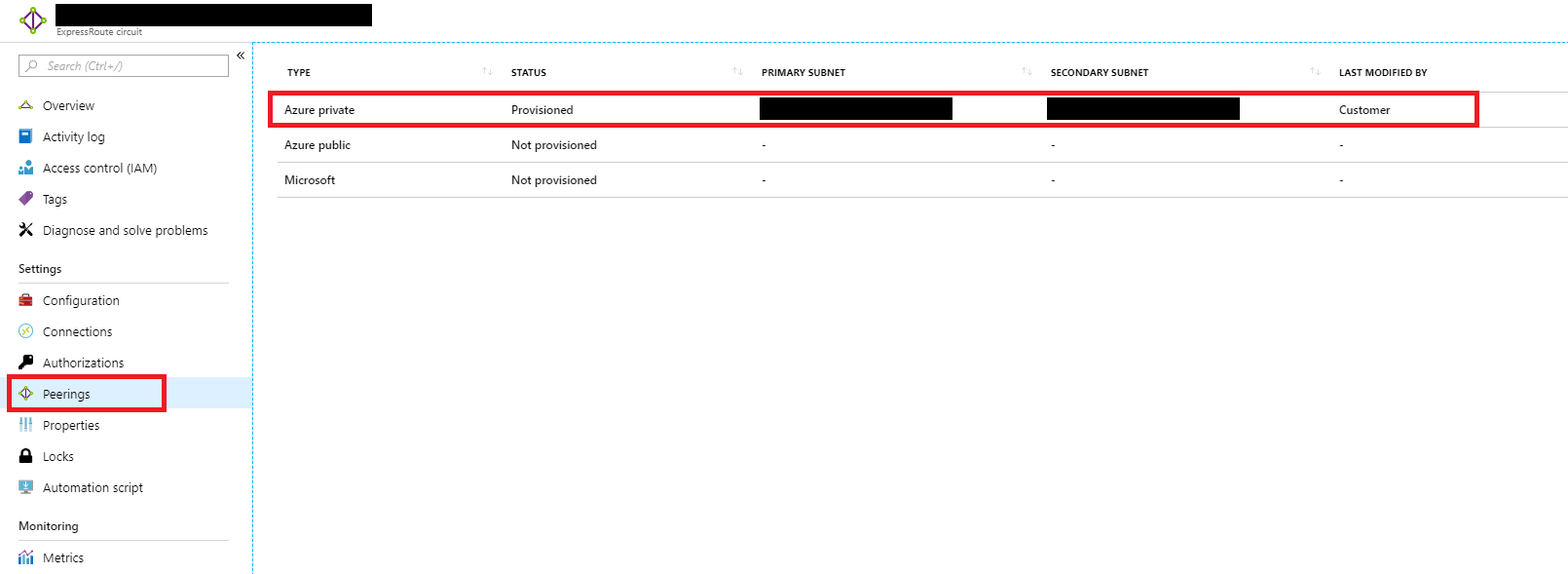 Now, under the Peerings section of the ExpressRoute circuit, we shall see something as follows.