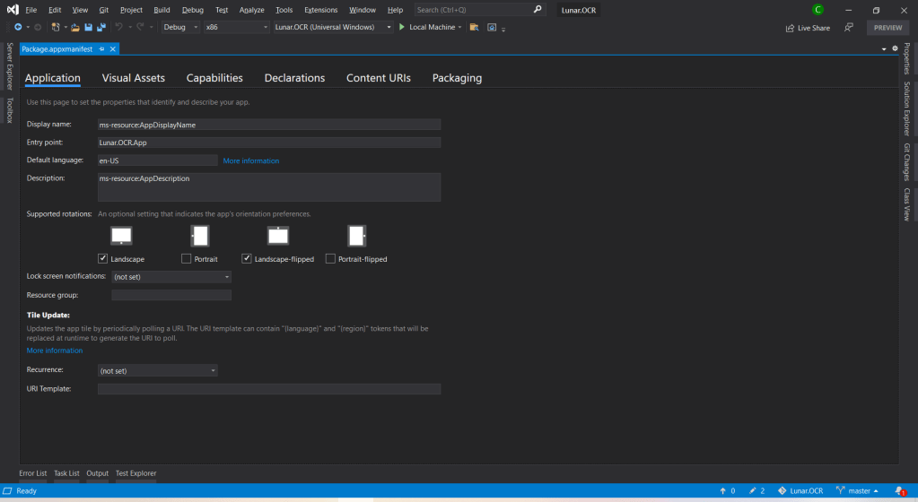 After that, we will proceed to configure our app manifest file Package.appxmanifest. It’s an XML file that contains the properties and settings required to create our app package.