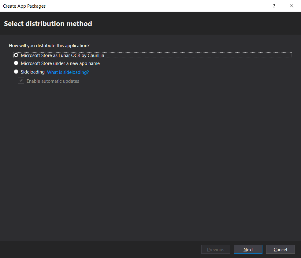 Since we have already associated the app, now when we proceed to create the app package, we will have an option to distribute to the Microsoft Store for the app directly.