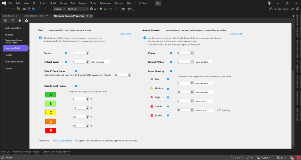 We can configure the SQALE Debt Ratio and Debt Rating.