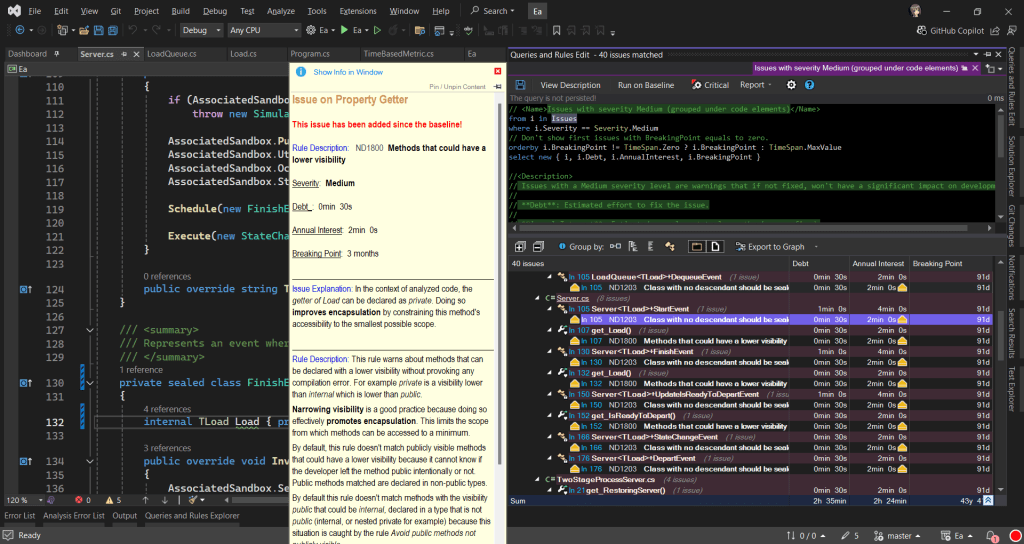 In Visual Studio, NDepend also provides interactive UI which indicates the number of critical rules violated and critical issues to solve. Unlike most of the static code analysis tools that show overwhelming number of issues, NDepend has this concept of baseline.